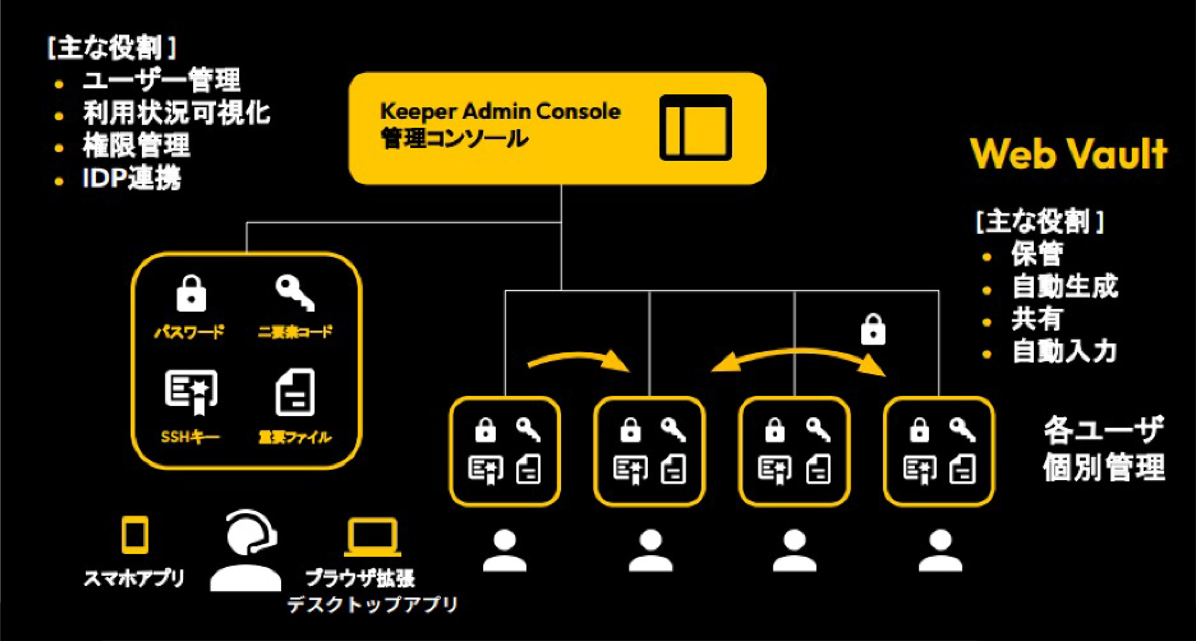 Keeper パスワードマネージャーは、企業や個人があらゆるアカウントのログイン情報、機密データ、ファイルを安全に管理・共有できるセキュリティプラットフォームです。ゼロトラスト・ゼロ知識アーキテクチャに基づき、エンドツーエンドで暗号化された環境を提供します。
