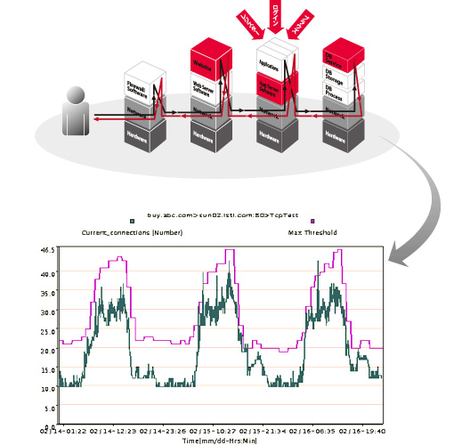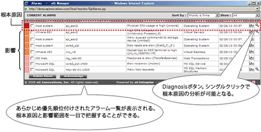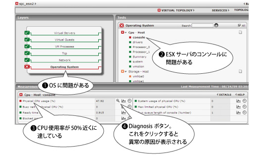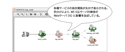 ネットワーク、サーバおよびアプリケーションそれぞれの依存関係を自動的に相関付けることにより、問題の切り分け・根本原因特定を自動化することが可能となります。