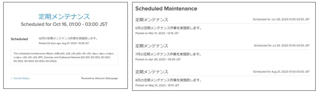 各メンテナンスごとに実施している内容が異なり、ユーザー(接続端末)によっても影響にばらつきがあります。そのため、発生回数や時間帯・影響の継続時間を事前告知することは難しいです。