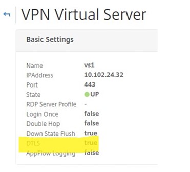 まずはお使いのCitrix ADC/Gatewayで、DTLS機能が有効になっているかについてご確認願います。確認方法は以下をご参照下さい。※ デフォルトではDTLSが有効化されています。
