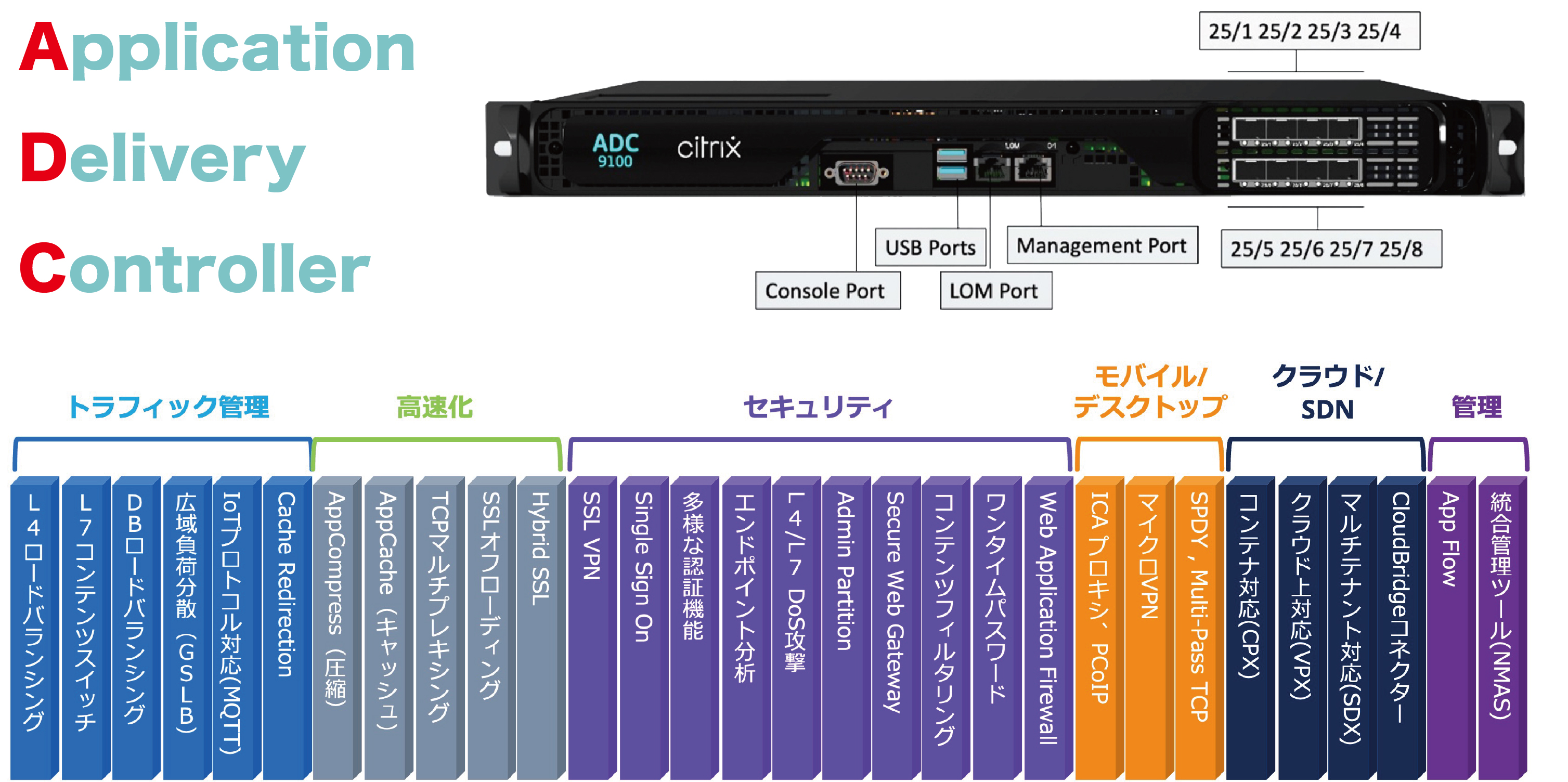Citrix NetScaler(旧称:Citrix ADC)ファミリーは、L4-7 スイッチング(ロードバランス)、サーバーオフロード、セキュリティ、Web アプリケーション高速化といった要素を包括的に提供するWeb アプリケーションデリバリー最適化ソリューションです。あらゆるアプリケーションのフロントエンドとして、高速なロードバランスとコンテンツスイッチング、コンテンツの圧縮とキャッシュ、SSL 処理、ネットワークの最適化などの機能を総合的に提供します。