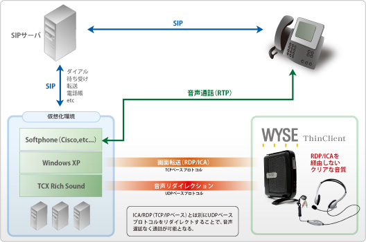 「Wyse TCX Rich Sound」は、シンクライアント環境における音声リダイレクション(音声通話等)をサポートするソフトウェアソリューションです。Wyse TCX Rich Soundを導入することにより、シンクライアント環境(RDP/ICA画面転送型)における音声リダイレクションの利用が可能となります。シンクライアント上に接続された音声認識デバイス(ヘッドセット等)を仮想環境上で認識し、ソフトフォンなどのアプリケーションを利用することが可能となります。